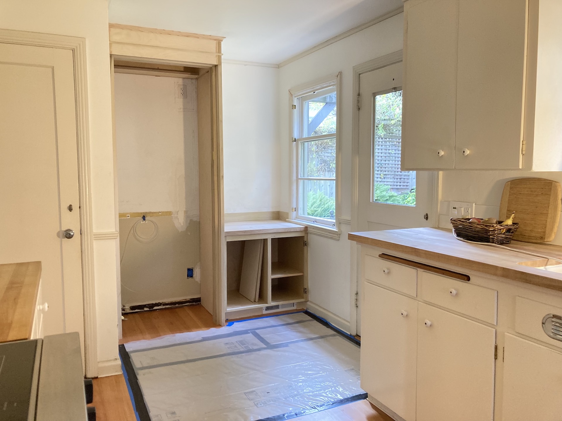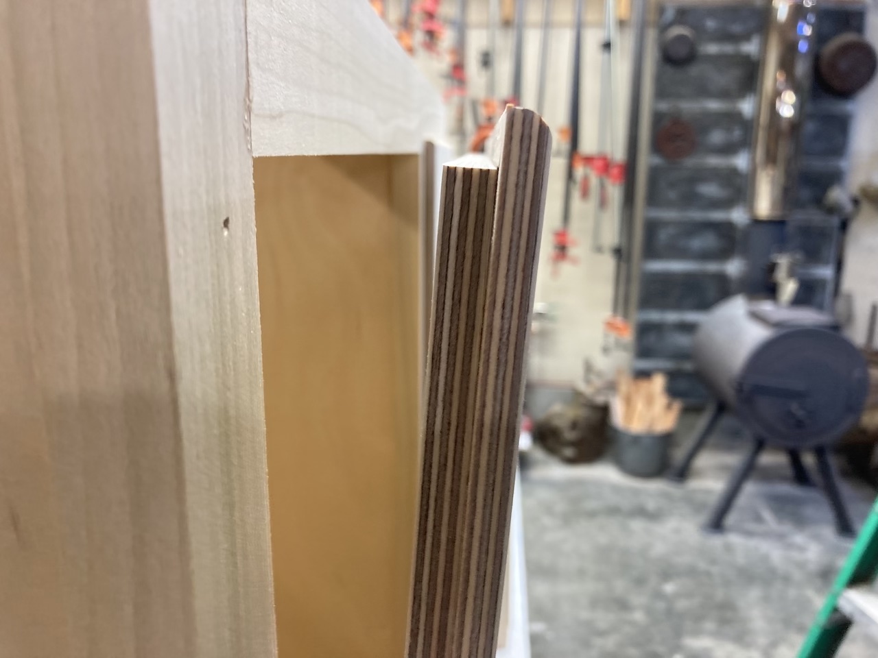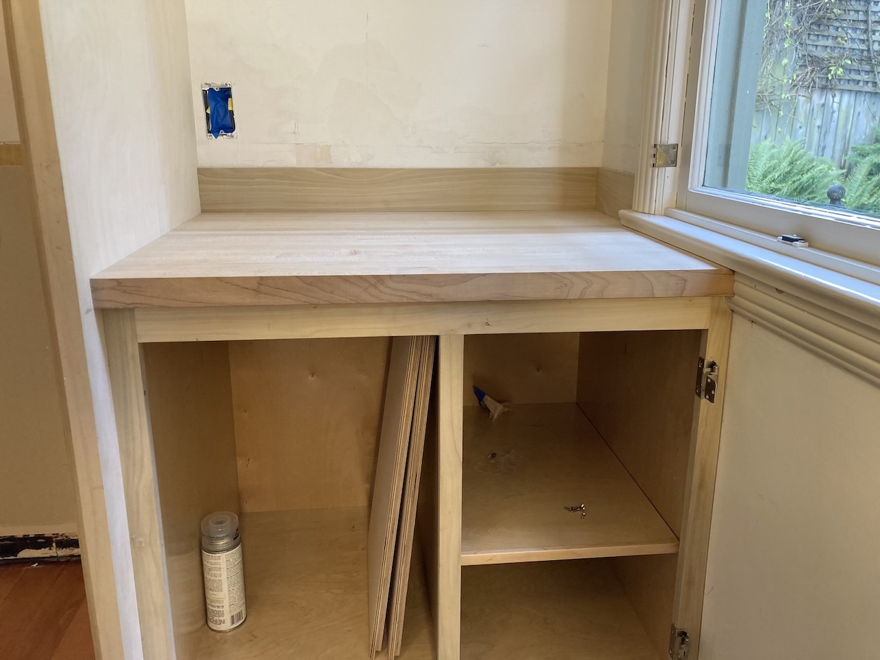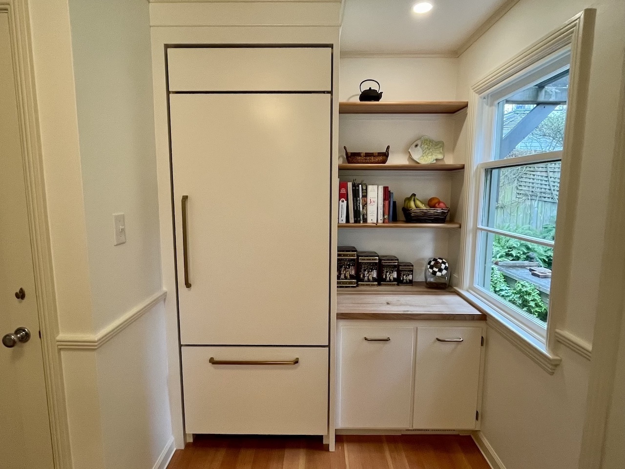 This custom cabinetry was built and installed to match the existing plywood kitchen cabinets. The original cabinets at some time had the doors replaced with 3/4″ plywood doors. These were a kind of 50’s update to the original and the customer wanted to match what they had. Although this is a more humble look compared to other custom cabinetry Ive built, it certainly wasn’t easy. For one thing the measurements needed to be precise because there wasn’t room for error. The reason is because the cabinets needed to fit from wall to wall, accommodate a zero clearance inset refrigerator, and the countertop needed to be exact to the stool. Not only that the ducting under the cabinet needed modification, and we wanted to keep the refrigerator handle as far away from the wall as possible for ease of reach. All this was accomplished through design work between Westbrook and the customer. When I build a project like this, the service I provide is working personally with the owner one on one. I also measure, build in the wood shop, procure hardware, and install at the customers home as an all in one experienced carpentry service. These were fun people to work with, like most of my clients. And as always you are welcome to contact Westbrook any time and visit the shop.